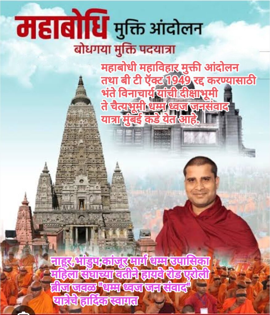 महाबोधी महाविहार मुक्ती आंदोलन तथा बी टी ऍक्ट 1949 रद्द करण्यासाठी भंते विनाचार्य यांच्या जनसंवाद यात्रा महाराष्ट्र राज्यातील विविध जिल्ह्यांमधून मुंबई कडे येत आहे.राज्यातील अनेक जिल्ह्यांमध्ये उत्स्फूर्त असा सहभाग नोंदविल्या जात आहे, ऐतिहासिक असा सभेचे आयोजन जिल्ह्यांमध्ये सुरू आहे.दिनांक 17 ऑगस्ट 2025 रोजी पवित्र दीक्षाभूमी नागपूर येथून या यात्रेचा प्रारंभ झालेला आहे.दीक्षाभूमी ते चैत्यभूमी या धम्म ध्वज जन संवाद यात्रा मुंबई कडे येत आहे.या यात्रेमध्ये जवळपास पूज्यनीय भिक्षु संघ,उपासक,उपासिका संघ सामील झाले आहेत.बिहार राज्य सरकारने षडयंत्र करून भंते विनाचार्य यांना जवळपास 68 दिवस कारागृहात ठेवले होते.कारागृहातून बाहेर येताच महाबोधी महाविहार मुक्ती आंदोलनाचा लढा अधिक तीव्र गतीने करण्यासाठी तसेच महाराष्ट्रातील तमाम बौद्ध बांधवांशी संवाद करण्यासाठी दिनांक 28 ऑगस्ट नाशिक, 29 ऑगस्ट कल्याण,30 ऑगस्ट डोंबिवली,31 ऑगस्ट ठाणे,