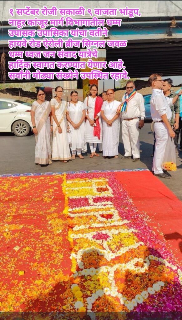 1 सप्टेंबर सकाळी ९ वाजता हायवे रोड ऐरोली ब्रीज सिग्नल जवळ भांडूप, नाहूर, कांजूर मार्ग विभागातील धम्म उपासक उपासिका धम्म ध्वज जन संवाद यात्रेचे स्वागत करणार आहेत.