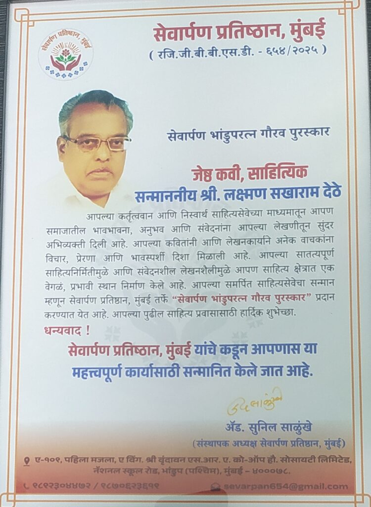 ज्येष्ट कवी साहित्यिक लक्ष्मण देठे म्हणजे कर्तुत्ववान आणि निस्वार्थी साहित्यसेवेच्या माध्यमातून समाजाची भावभावना,अनुभव व संवेदनांना आपल्या लेखणीतून समाजाला देणारे कवी साहित्यिक आहेत. सामाजिक बांधिलकी ठेऊन त्यांनी विचाराची प्रेरणा आणि भाव स्पर्शी करणाऱ्या शब्दात कविता त्यांनी लिहून त्यांचे लोकप्रिय गीते झाली आहेत. त्यांनी लिहलेल्या कविता गीत म्हणून सादर केल्यामुळे अनेक रुपेश गौतम अनिल नावा रूपाला आले आहेत. त्यांच्या सातत्यापूर्ण साहित्यनिर्मितीमुळे आणि संवेदनशील लेखनशैलीमुळे त्यांना सेवार्पण प्रतिष्ठान मुंबई तर्फ सन्मान चिन्ह शाल आणि सन्मानपत्र “सेवार्पण भांडुपरत्न गौरव पुरस्कार” प्रधान करण्यात आला.